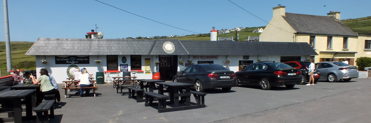 Off we go to Dunquin, at the western tip of the Dingle Peninsula. Coming over a rise, we have a view of the Blasket Islands--the Great Blasket, Beginish, Tearaght (sometimes mistaken for Skellig Michael by confused tourists), Inishtooskert (commonly called the Sleeping Giant for its distinctive profile), and others. A visit to the Great Blasket is on our radar, but just now we're headed for Kruger's Bar for a pint of Guinness and a toastie. Kruger's (soft g, like "Krujer's") is the westernmost pub in Ireland. I see it billed sometimes as the westernmost in Europe; I suppose that claim will rest on whether you think Iceland and the Azores are part of Europe or not.