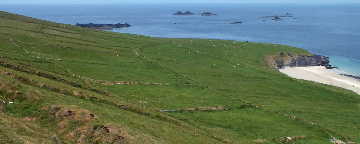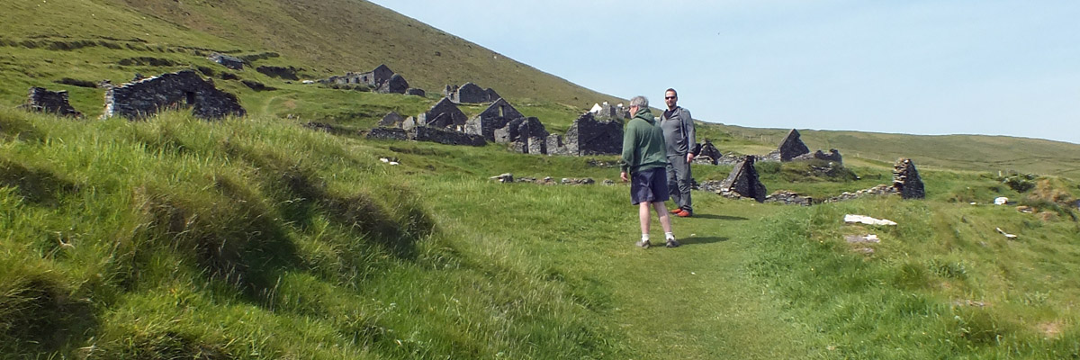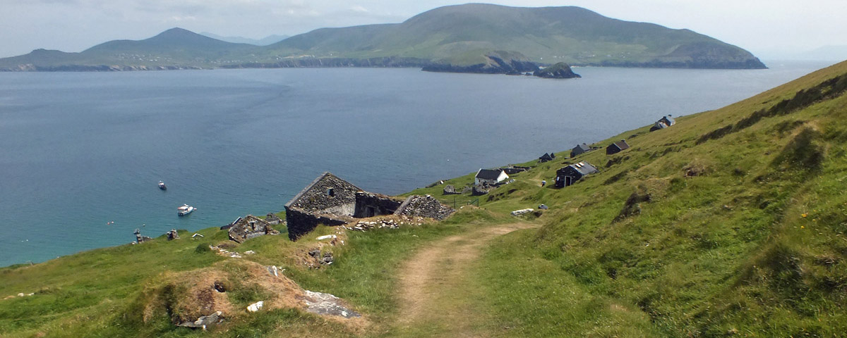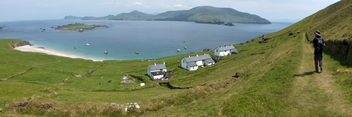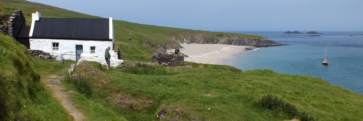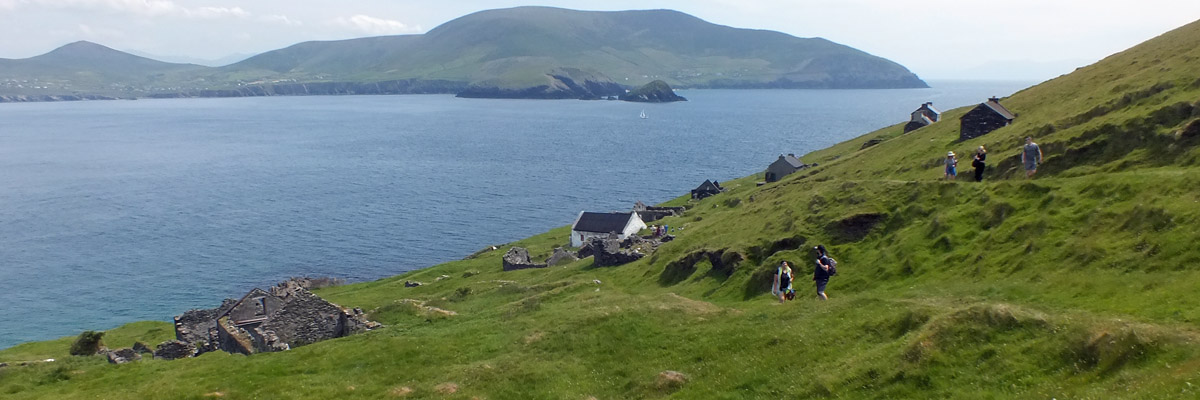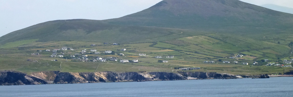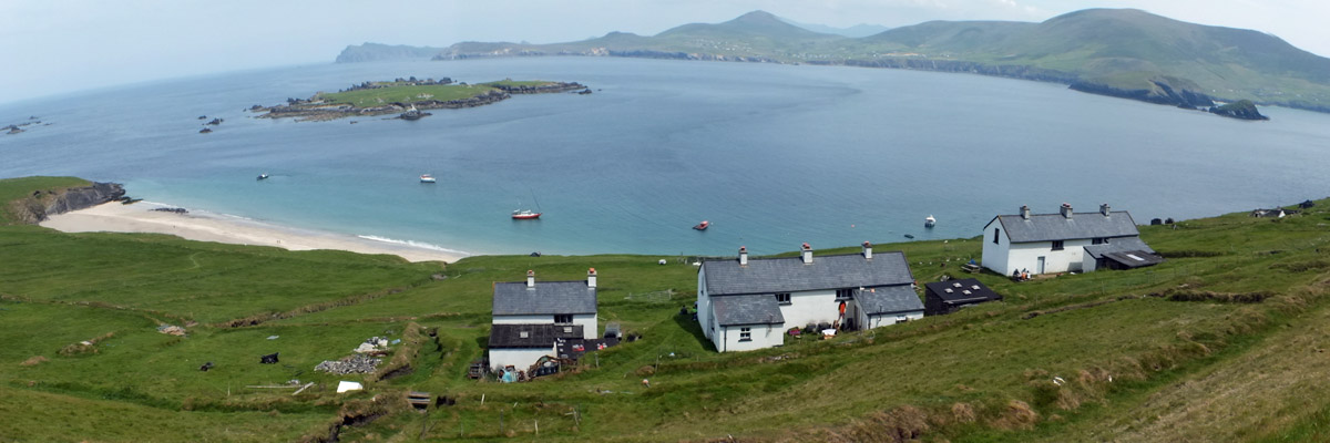 Bobby and I sit at the café, at the top of the village, while Ron goes down to the beach. After a while, I walk up the trail above and meet Ron at the shoulder of the bowl, from where we can look down the length of the island. The Great Blasket is shaped like an eel, about four miles long; we can see down to a peak about halfway along. I wish I had come here when I was fit enough to follow the trail to the other end.