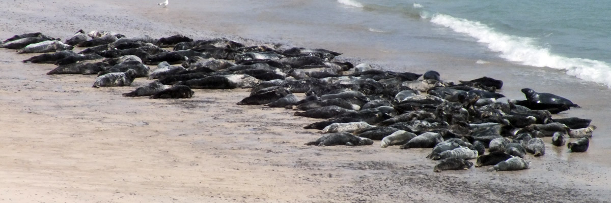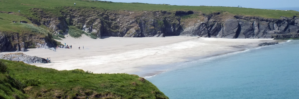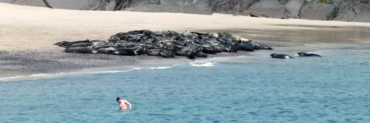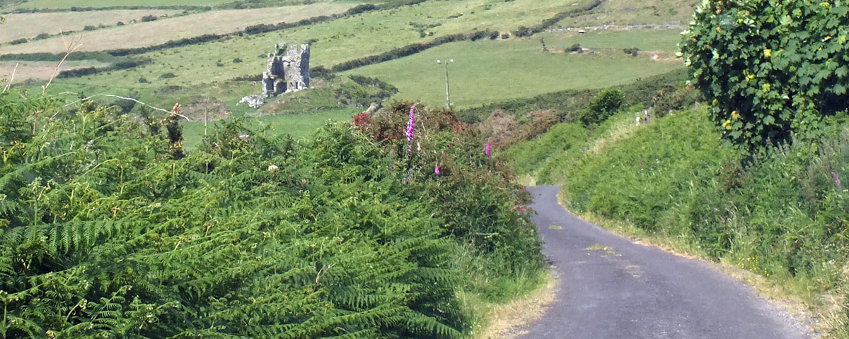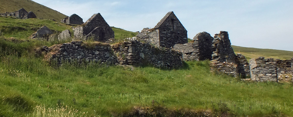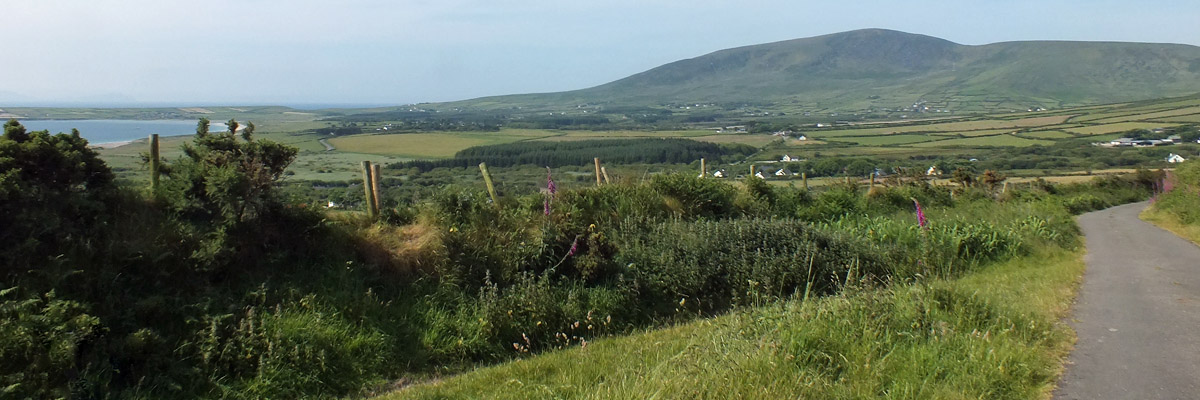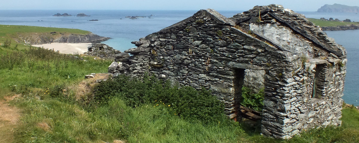 Bobby and I sit at the café, at the top of the village, while Ron goes down to the beach. After a while, I walk up the trail above and meet Ron at the shoulder of the bowl, from where we can look down the length of the island. The Great Blasket is shaped like an eel, about four miles long; we can see down to a peak about halfway along. I wish I had come here when I was fit enough to follow the trail to the other end.