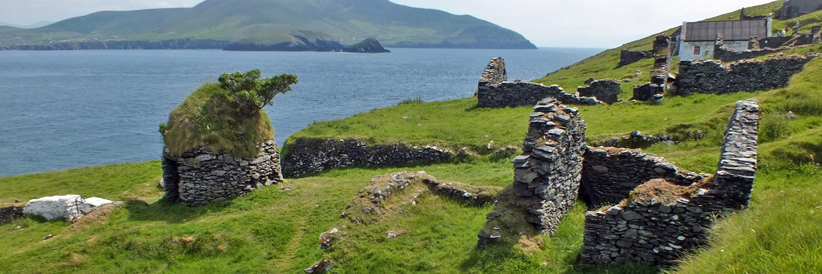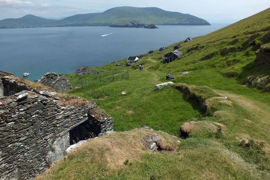 The population of the Great Blasket was never much more than 150. There was a sharp dip following the Famine--I believe emigration started in earnest around then. Nevertheless, the population rebounded, reaching 160 in 1911. Serious depopulation followed WWI. By 1951, only 27 were left. The final blow was the illness and death of a young man during bad weather, when no doctor could reach the island. The residents were evacuated in November of 1953, all but one family who held out until the following year--1954, the year of my birth. Odd to think of the abandonment coinciding with my lifetime. The ruined village inevitably reminds me of Clearance villages I've visited in Scotland, emptied more than a century earlier. The tenant farmers there seemed to prefer steep bowls with good drainage, and the eastern face of the Great Blasket here is a beauty. I'm also reminded of St Kilda in Scotland, evacuated a couple decades before the Blasket. I've come to accept that I will not likely ever visit St Kilda, and am thinking this is the closest I will ever have to that experience.