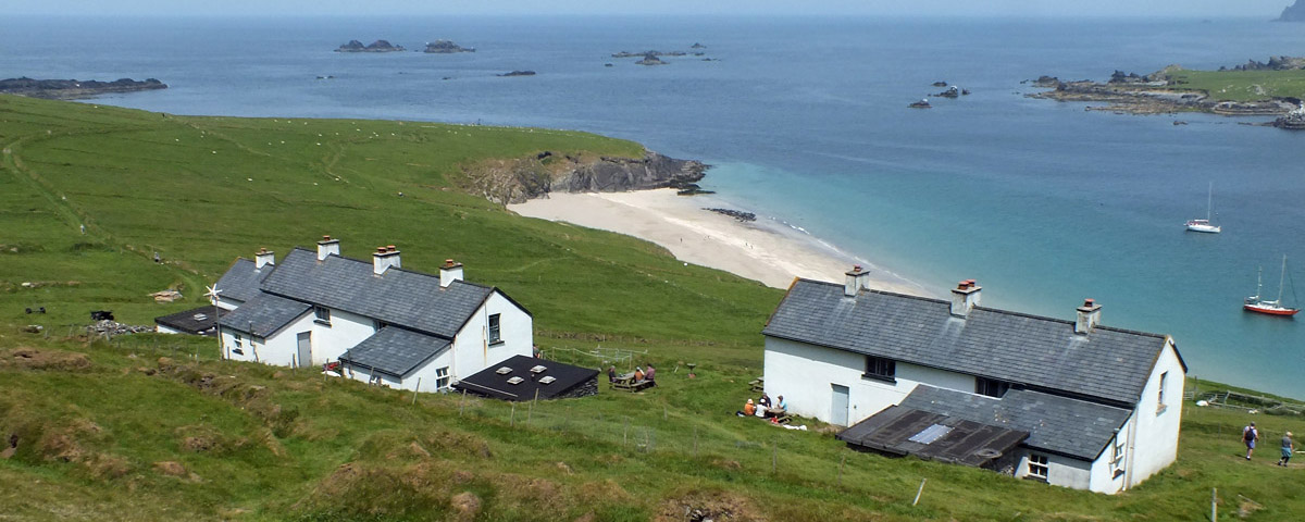 While there have been no permanent residents here for almost seventy years, there are five cottages available for rent in summer, nicely furnished, if the photos I've seen can be trusted; otherwise very rustic, without electricity. It's possible to pick up a cell signal from the mainland, but there's no way to charge your phone. There's also a hostel and a café. A caretaker couple live on the island for the season. It's a highly coveted position; there were more than 100,000 applicants this past year. The winners were a couple from London--she originally from Cork--who took sabbaticals from their jobs. Self-sufficiency and handyman skills are no doubt indispensible attributes.