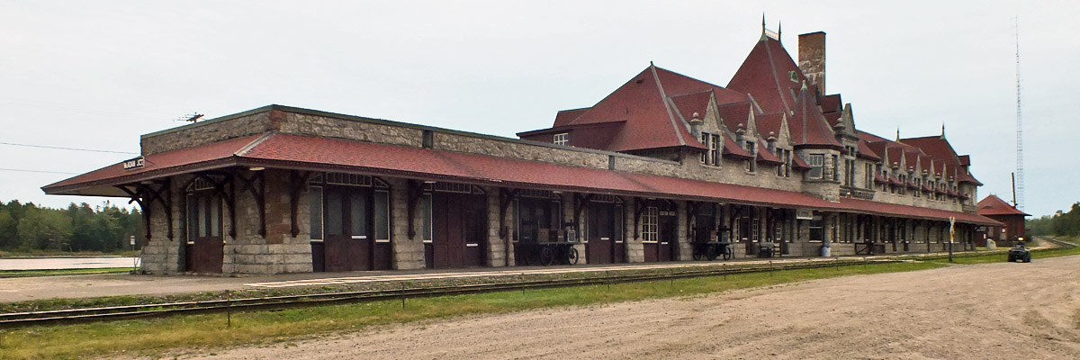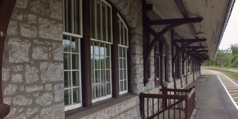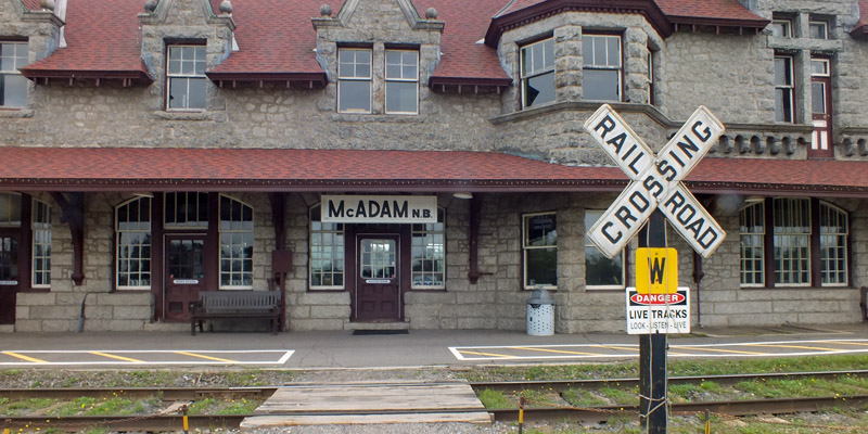 Monday 18 September 2023---It's about 120 miles from Lincoln, Maine to Fredericton, New Brunswick on Maine Route 6 and New Brunswick Route 4, through pretty much the middle of nowhere. The rather grand railway station at McAdam (pop ~1200), five miles across the border, might then come as a surprise. For many years, Canadian Pacific's Atlantic Limited ran from Montreal to Saint John NB through northern Maine, connecting with a line to Bangor and points south, and McAdam was a major port of entry. The route declined in the latter half of the 20th century, and ceased operation altogether at the end of 1994. The station houses a tourist information office and a museum, both now closed for the season. We take a walk around, and I get some photos through the windows.