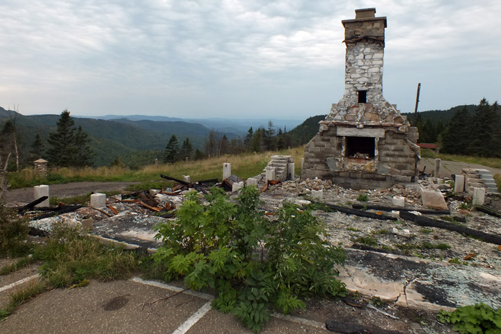 Today's the day to take a drive around the area--I want to make sure the car is okay before tomorrow's departure. There is no trouble with it, aside from the need to pump the clutch for a while. We start by going up the hill back of town, where we look at the remains of l'Auberge du Gargantua, a popular hilltop restaurant and bar that closed in 2011. The empty shell burned to the ground just last October.