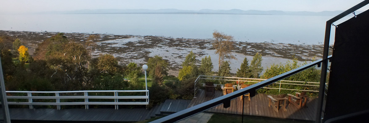 It's a half-hour drive to the ferry that crosses the mouth of the Saguenay River, and just a few minutes from the landing on the other side to our lodgings. I had some trouble finding somewhere reasonably priced to stay here, and ended up booking an apartment that was a bit more expensive than I would have liked, and looked, in the online photos, rather cozy (i.e. small). It turns out to be quite spacious and well-appointed, and I feel some regret that we are only staying two nights.