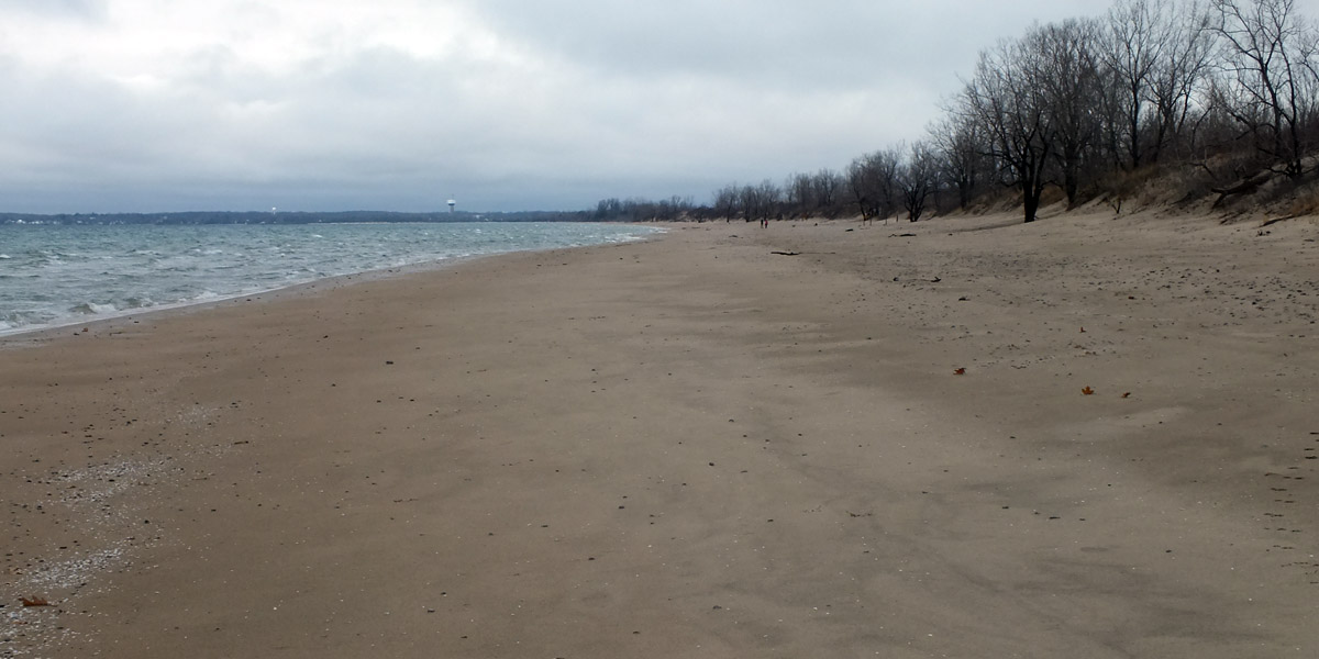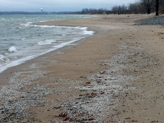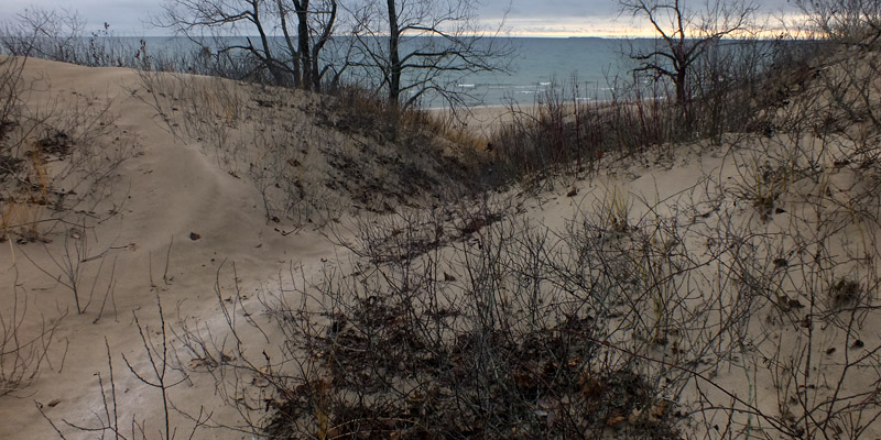Wednesday 22 November 2023--Beach day! I get coffee and a bagel at the local Tim's, then drive back around West Lake and park at the start of a trail through the dunes. I'm thinking it will take me out toward the middle of the four-and-a-half mile long Lakeshore Beach, but I end up instead at the southern end, a mile walk from where I parked. Along the way, I note that the road to the main parking area, which was gated when I drove by it yesterday, is open. So back I tromp to the car, and drive down to the car park. It's a short walk from there through the dunes to the beach. I see some people in the distance, but feel I have the beach pretty much to myself. I understand that in summer, entry to the park is by permit, available five days in advance, and in high demand.