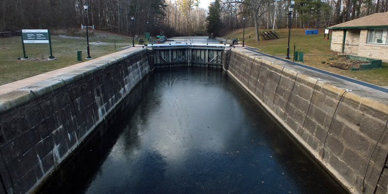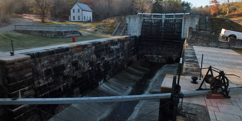 It's evident from scaffolding that work is being done on the upper lock, and as I walk back to my car, I happen to catch one of the workmen as he is knocking off for the day. He tells me that the masonry in each lock has to be disassembled and rebuilt occasionally. This is done when the canal is closed in winter, under a heated tent. It's not until I'm driving back to Westport that it occurs to me to ask him how often this needs to be done, and a thousand other questions.