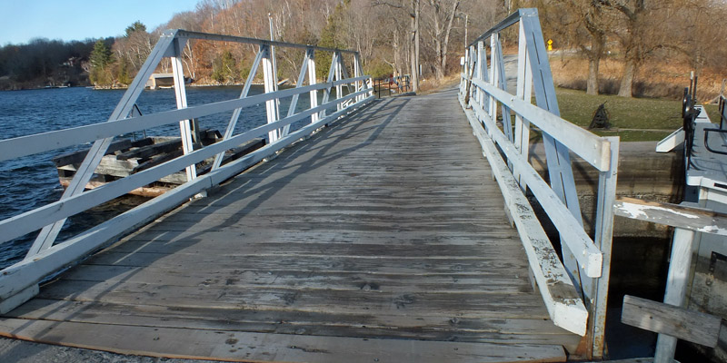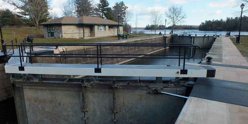 It's a short drive from Newboro to The Narrows, where a causeway separates Big Rideau Lake from Upper Rideau Lake. The lock here, like the one at Newboro, has a lift of about three feet; ten feet is typical. A blockhouse is testament to the strategic importance of the spot--it would have been easy for invaders to breach the causeway, making the canal impassable at Newboro. Colonel By proposed the construction of twenty-two such blockhouses along the canal, but only four were built, owing to budget concerns. A wooden swing bridge carries the modern road, built some time after the canal, across the channel just above the lock. Such bridges are themselves objects of historical interest, and wherever possible are maintained to appropriate specs. They are operated by the same park staff who work the locks, and some are said to be so well balanced that one person can push them open and closed.