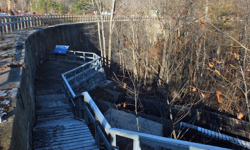 Another twenty minutes south and west, I come back to the canal. Jones Falls might be the most impressive piece of engineering on the entire route. The stone arch dam at the top of the site is a bit lost in the landscape today--it's not even visible from below--but it doesn't take much imagination to realize what an extraordinary structure it was for the time. At 60 feet, it was the highest dam in North America. The stone was drawn by oxen from a quarry six miles away. The dam floods a ravine a mile long, with a drop of 59 feet. There were originally meant to be six locks, each with the usual ten-foot drop, but early in the planning process, Colonel By realized that the 108-foot length of each lock, tailored for the expected barge traffic, would be insufficient for steamboat travel, an industry then in its infancy. Thus all of the locks on the canal are 133 feet long. It's undoubtedly due to By's foresight that the canal did not face a prohibitively expensive refurbishment, or, more likely, abandonment, in the following decades, as happened to so many others. But the increased length presented a problem here. As at several other sites, the locks were built in a snie, a dry flood channel, adjacent to the current watercourse. There was only so much room. By redesigned for four locks, each with a fifteen-foot lift, which was considered extreme, and which necessitated particular care in construction.