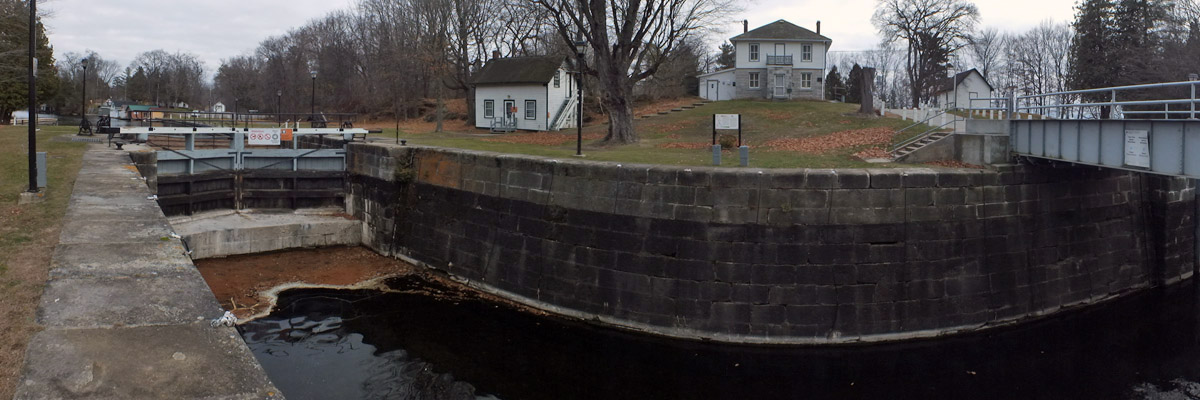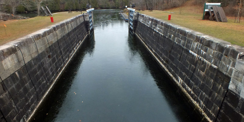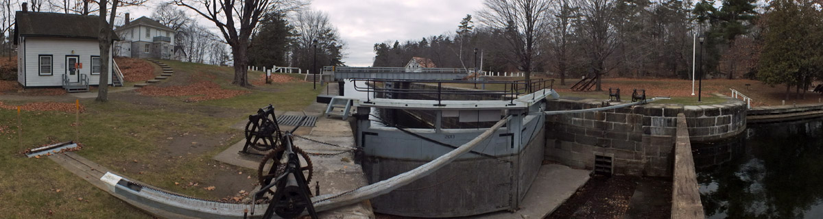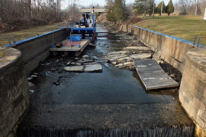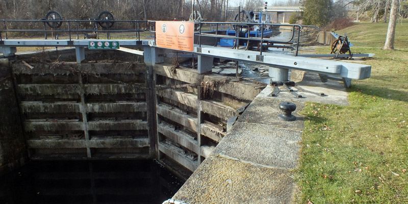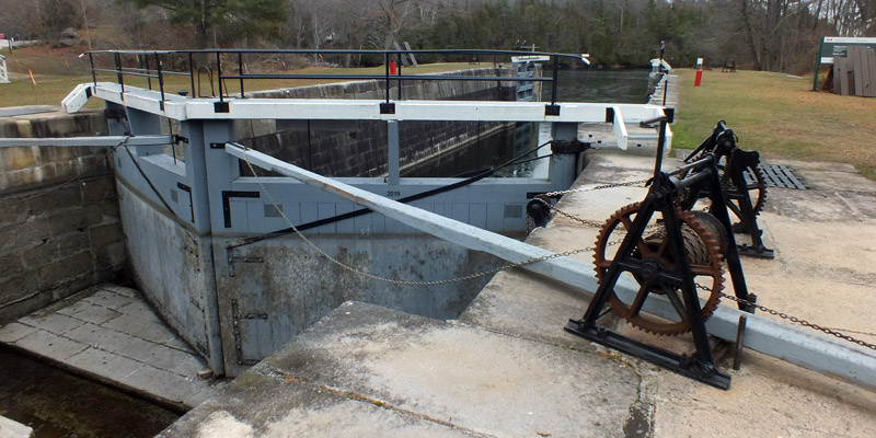 There's a good example here of a winter dam formed by stop logs, dropped into slots in the masonry above and below the lock gates. These keep the gates free of ice and pressure for the offseason, and allow any necessary work to be done.
