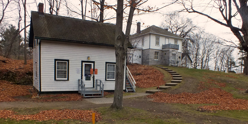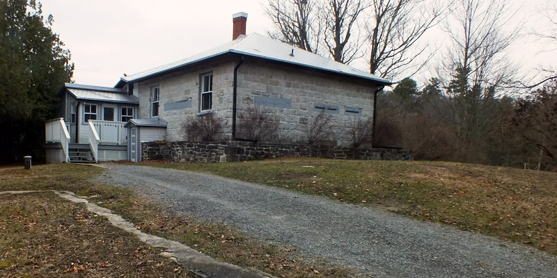 Saturday 25 November 2023--I start to the south again today, to pick up the two lock stations that lie between Newboro and Jones Falls. The first is Davis, easily the most remote lock on the canal, five miles or so from route 15. There is no through road; I suppose it's possible that there was one once, but I see no evidence of it, and besides, there isn't much of anywhere to go on the other side. So it's a dead end, and a very quiet spot. A defensible lockmaster's residence was built on a rocky knoll overlooking the site in 1842, similar to others along the canal, late substitutes for the blockhouses that were never built. This one was made uninhabitable by a fire in 1983. It was rehabilitated in 1999 by private ownership, and is now available as a holiday rental. [At this writing, it can be found on Airbnb.] Undoubtedly the knoll would have been kept clear of foliage back in the day, but trees and bushes, bare in November, must obscure the house in season now. Such a privacy screen seems redundant, in this secluded spot. The gun slits in the walls might be unnecessary at this point, as well.