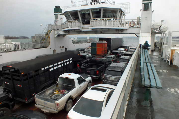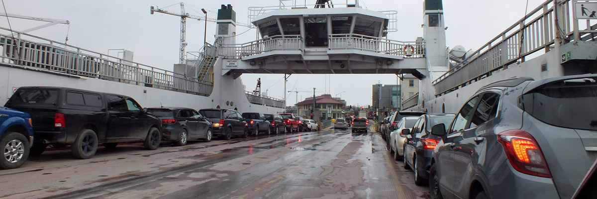 I head for the dock at 8:00, figuring that the 8:30 run will be the busiest of the morning. And so it is: there's a long queue already waiting. I fall in behind a large dairy tanker and watch as several small school buses drop off students. There are commuters being dropped off by their spouses, or parking their own cars to board on foot. The Wolfe Islander III arrives, and as it fills, I think I'm not going to get on. Indeed, the tanker in front of me is stopped, but I'm waved around, and the car behind me, as well, the last two vehicles to board. The tanker and everyone else behind will have to wait another hour to cross, and some indeterminate time for the Wolfe Islander IV to go into service. The new electric ferry has 50% greater capacity, but the need for charging time means it will likely run every 90 minutes instead of hourly. The original plan to run the III and IV in tandem has now been shelved, apparently because of labor shortages. It appears, then, that the anticipated increase in capacity is no increase at all.