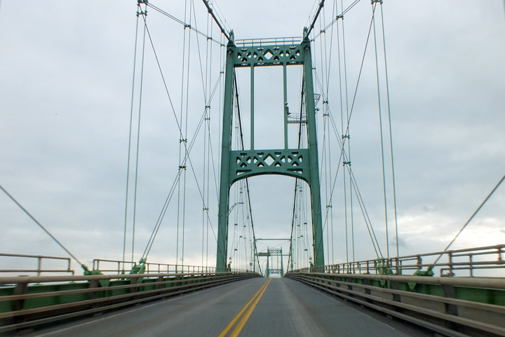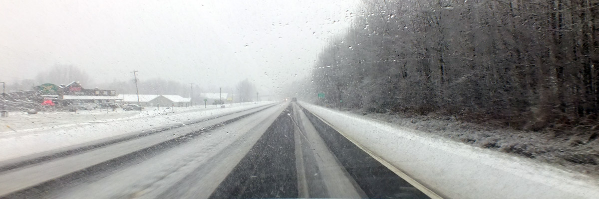 And now I retrace my route home, along route 2 to Gananoque (where I stop at the Metro to buy more Stoned Wheat Thins), along the Thousand Islands Parkway, over the bridges, to the same gas station outside Alexandria Bay, where I fill up. Run into a lake effect snow squall somewhere east of Watertown. I remember my dad telling me that nearby Fort Drum was the most dismal place he was ever stationed, perpetually cold and gray. On I go, nonstop, aside from being pulled over for doing 75 in a 55 zone on route 12. I get off with a warning.