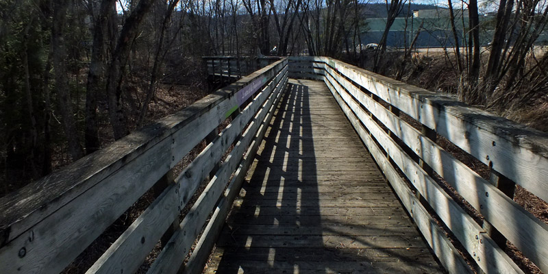 The boardwalk runs down behind the commercial lots at the western end of the village. The wooded gully is the sort of place you might expect to find abandoned shopping carts and other detritus; thankfully, it's been kept reasonably clean. There's a pleasant little waterfall along the way. The only other humans I see are a couple of gents whom I take to be homeless. They avoid eye contact. There but for the grace.... I've been fortunate in life. I don't think I would survive long in such a situation.