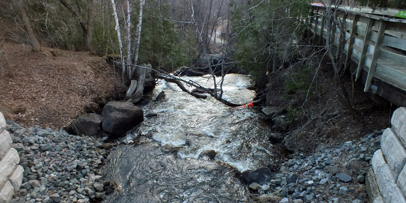 There's a park where the Ruisseau Clair joins the Rivière du Diable, which rises somewhere far north of here, and runs into the Rivière Rouge a few miles south. The Rouge in turn empties into the Rivière Outaouais--the Ottawa River--some thirty miles farther south; the Outaouais, of course, joins the St Lawrence near Montréal, on its eventual way to the Gulf of St Lawrence and the Atlantic Ocean. A few centuries ago, the water routes would have been traveled by les coureurs des bois, the runners of the woods, who traded with the indigenous people for beaver pelts, to meet the demand in Europe for fur to make the felt hats that were the lasting fashion in Europe. Beaver is the only fur that felts so naturally; when beavers started to get scarce, hatters developed a method, involving the use of mercuric nitrate, to felt rabbit and other fur. Long-term exposure to mercury has terrible effects on the human nervous system. Thus was born the proverbial mad hatter. Beavers have not been trapped for a long time now, and the population has rebounded across North America. There is sign of their activity here on the banks of the Diable.