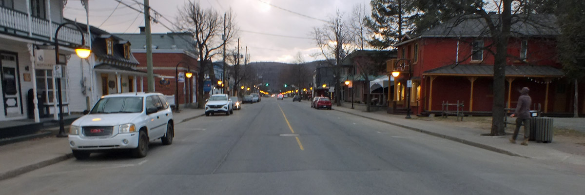Up on the main street, I pop into the SAQ (the provincial liquor store) to peruse the offerings. I bought a bottle of whisky in New Hampshire, on the way north; the prices there are much better than here, but I'm still interested to see if there's anything I can't do without. The local products, cider and ice cider, are more attractive, but I pass on them, too. At the grocery across the street, I buy a few cans of beer and a jar of mustard to go with the sausages. I arrive at the sausage shop five minutes after closing. Oh well, there's always tomorrow.