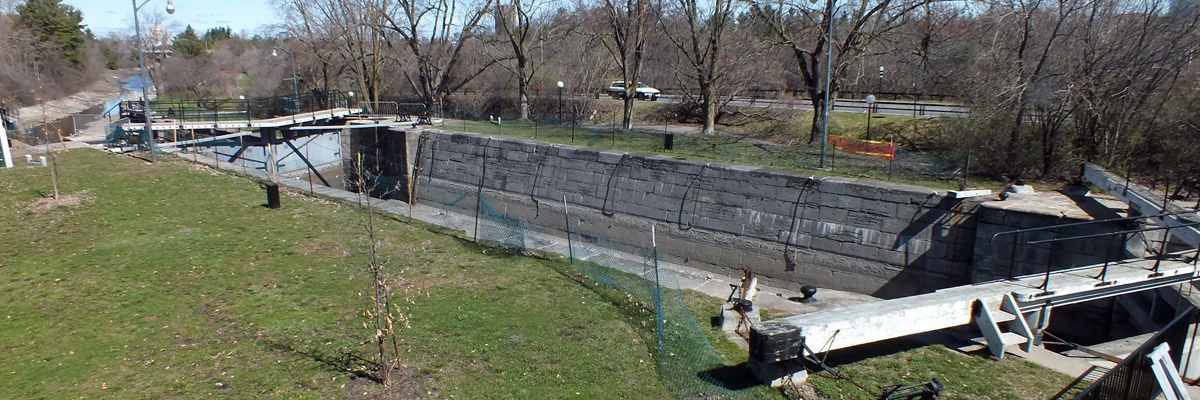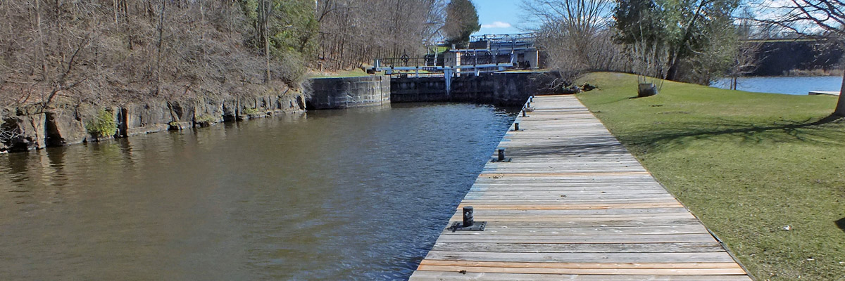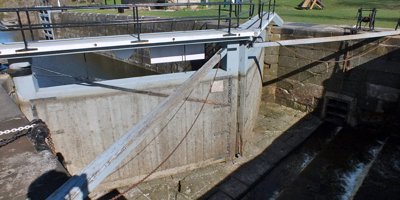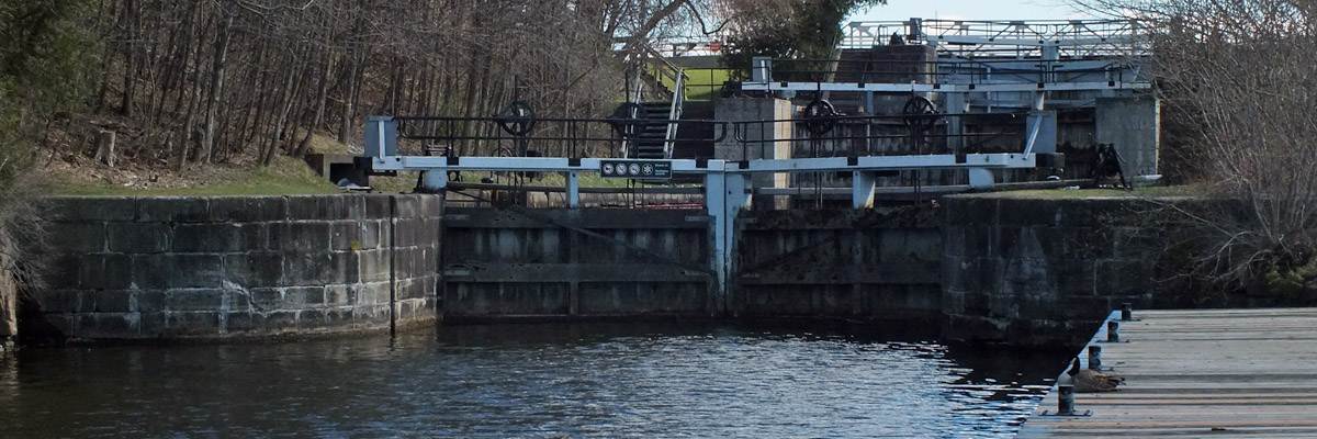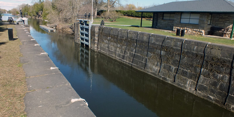 The lock at Black Rapids, number 13, is one of three along the canal that were electrified by the Department of Transport, the beginning of a modernization program that ended when Parks Canada took control. The dam here was not as troublesome as that at Hogs Back, but it did present problems. For one thing, the land here is flat, and the river fairly broad; the dam had to be extended considerably farther than planned to keep floodwater from flowing around it. Colonel By had at first intended to make all of the dams along the canal overflow dams, meaning water would flow over the top all along the length of it. He quickly learned that ice damage and erosion made this impractical, so most of the dams were built higher with no intended overflow, excess water instead passing through an adjacent waste weir with an adjustable gate. The dam was still subject to considerable flood and ice damage. A new dam was built in 1862, and subsequently replaced by the existing concrete dam in the 1950s.