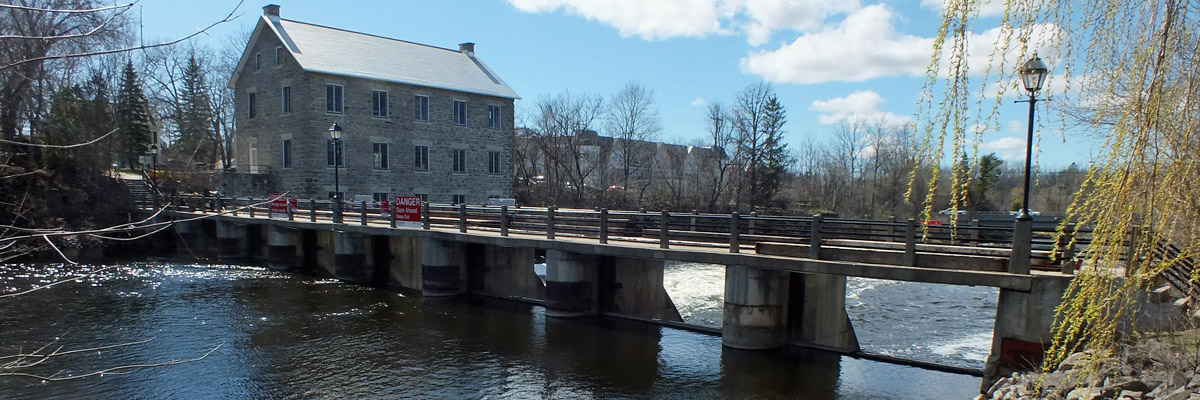 A mile and a half or so upstream from the locks, a bridge leads across Long Island to the village of Manotick. When the weir was moved to its current position, a dam was built in the west channel here, to assure sufficient depth in the east channel. The dam provided enough drop for Moss K Dickinson to build a flour mill in 1860. Dickinson had built a shipping empire that moved lumber and agricultural goods along the Rideau Canal and Ottawa and St Lawrence Rivers, as well as into the Lake Champlain and Erie Canal corridors. With railroads providing increased competition, Dickinson sold his transport interests in 1869, and concentrated on the Manotick mill complex, which eventually included grist, saw, and carding mills, a cooperage, and a bung, tap, and spile factory. He also found time to serve as mayor of Ottawa from 1864 to 1866. Over the last decades of the 19th century, much of the complex either burned down or was dismantled, but the flour mill operated under various ownerships until 1963. Today, the mill and the Dickinson House comprise a museum dedicated to Moss Dickinson's legacy. It's closed at this time of year, of course. I'll have to devote more time to Manotick, on another visit.