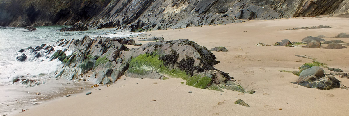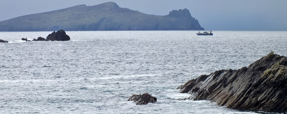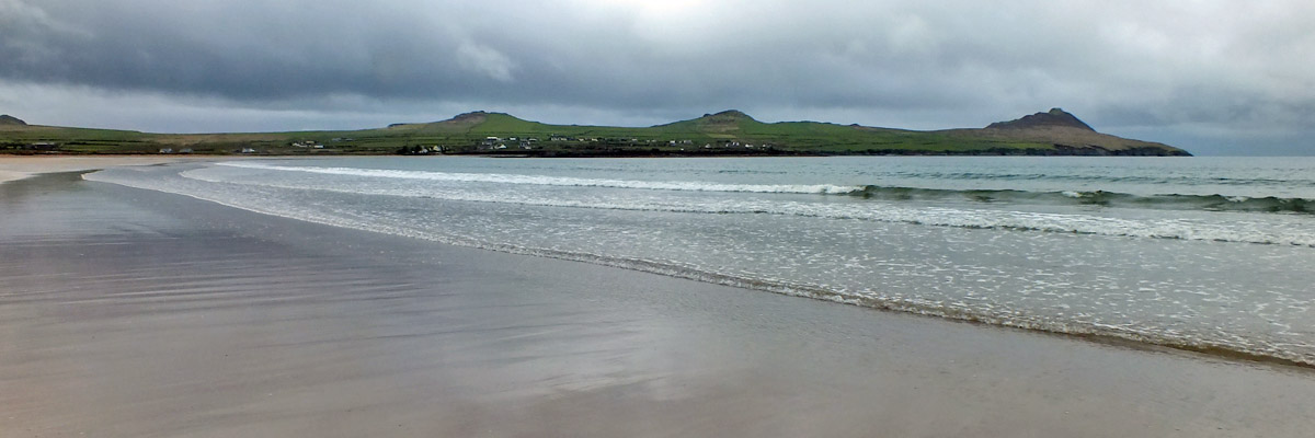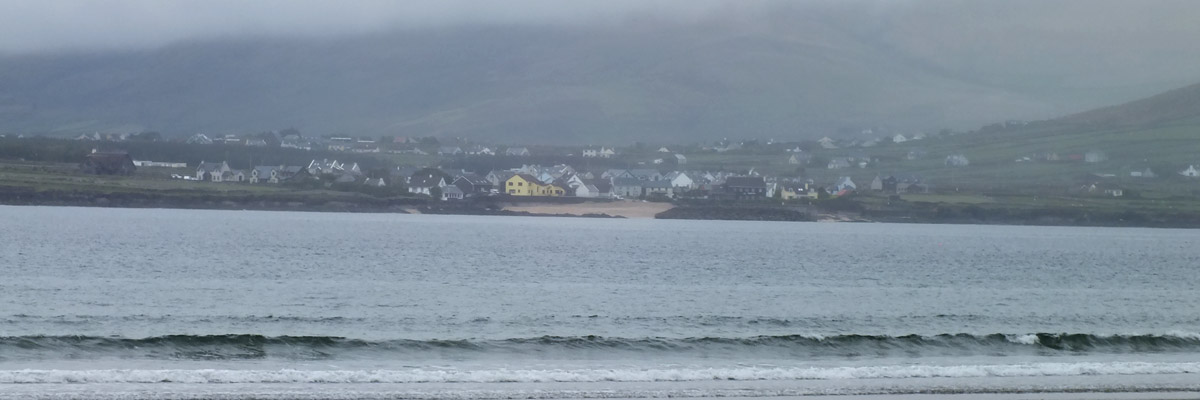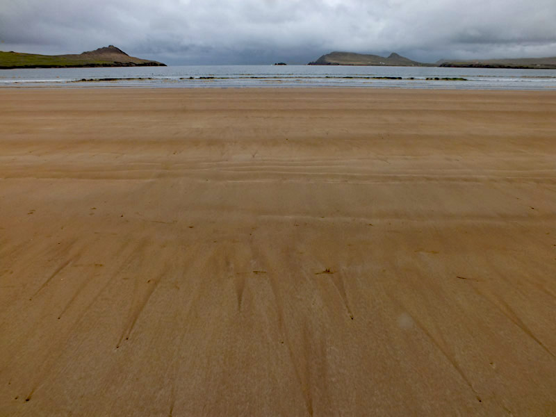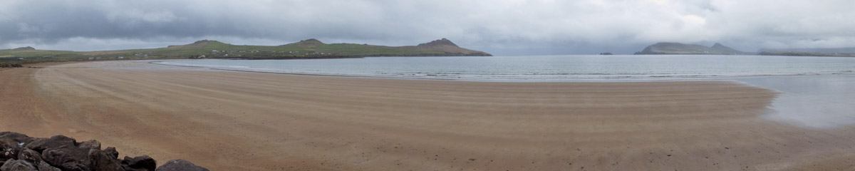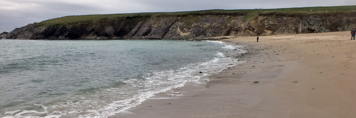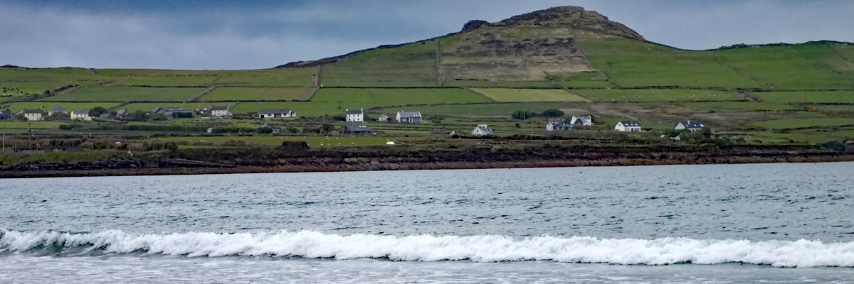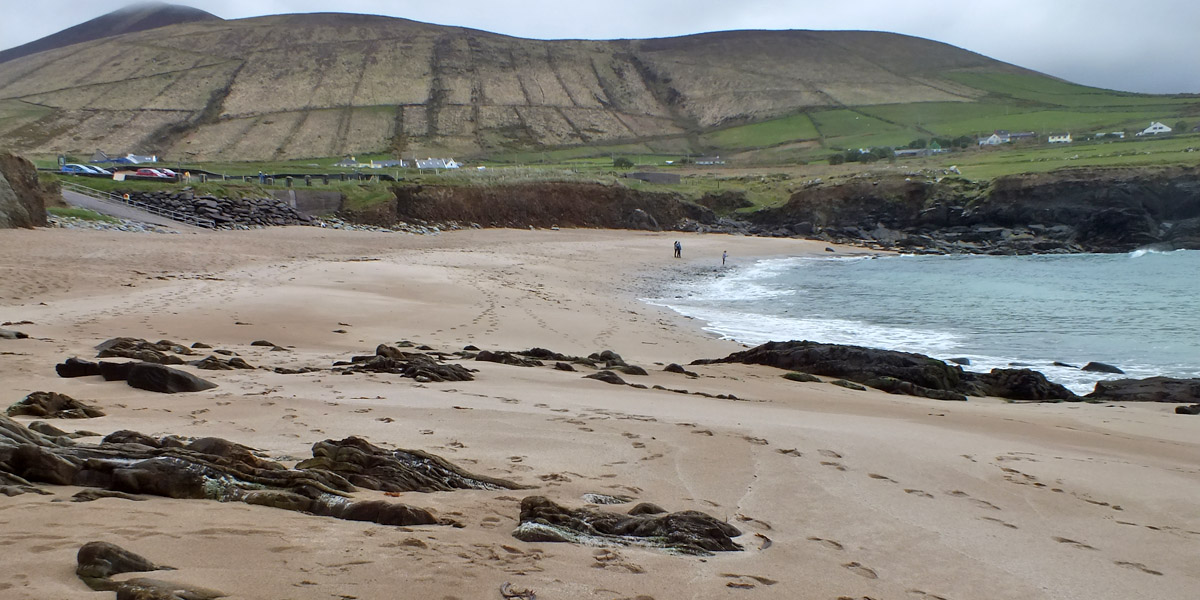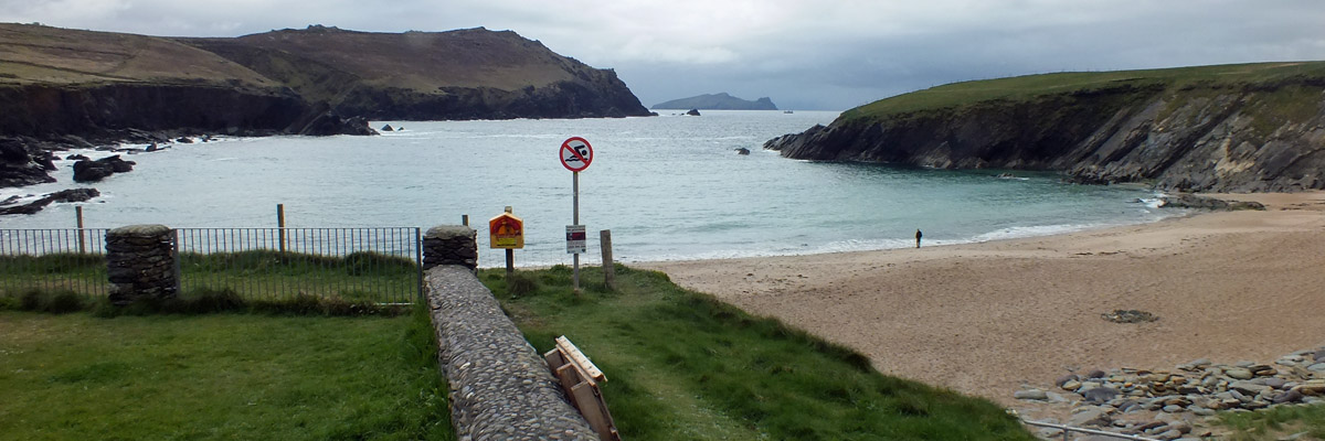 Tuesday 30 April 2024--After breakfast, I make the ten-minute walk from my guesthouse to the lads'. It would take about three if I could go in a straight line--I can see their place out my window, across the athletic field, which unfortunately I cannot cross. Brendan greets me and offers me coffee while we wait for Bobby to do whatever it is he needs to do. By the time we get to Dunquin, it's lunchtime, so we pop into Kruger's for a toastie. Then it's a leisurely half-hour or so on the Clogher Strand, followed by more time on Béal Bán, one of the several beaches ringing Smerwick Bay. Dick Mack's brewery in Dingle has a beer named after the beach. When the lads ordered it last night at Foxy John's, I thought they were saying "bail bond".