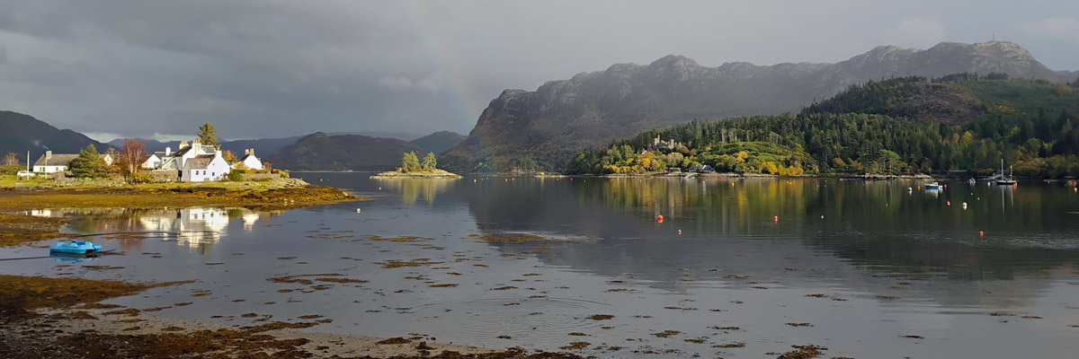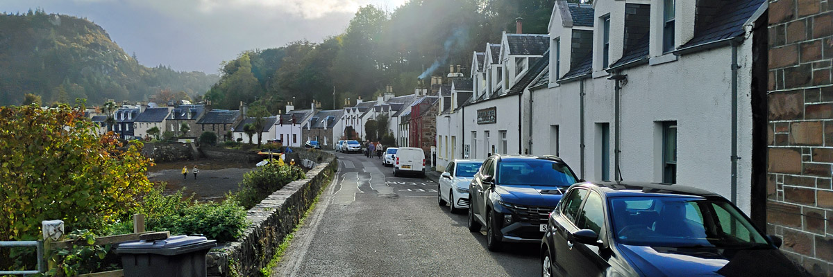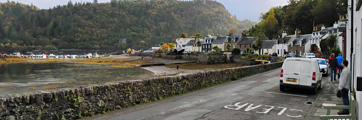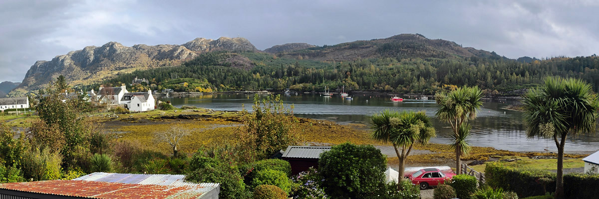 On we go, over and down into Strath Carron, along the south shore of Loch Carron to Plockton. We're staying in a new guesthouse for us, right on Harbour Street. Our hosts are apparently off on holiday somewhere; the fellow they've entrusted to check us in takes our payment, hands us a set of keys, and disappears. The keys are superfluous--the front door isn't locked, and the only reason I'd bother locking our room door would be to guard against accidental entry by other guests, of which there are none.