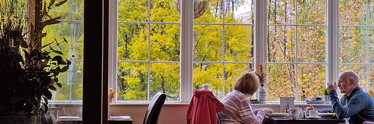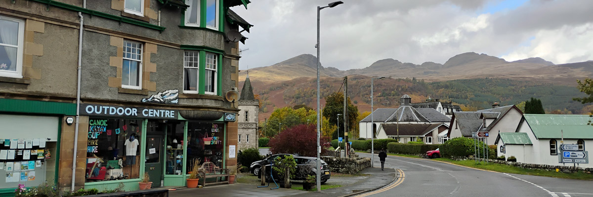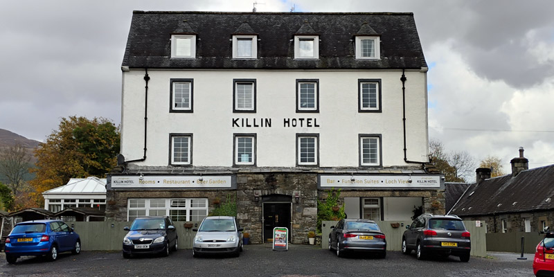 The full circuit of Loch Tay takes about an hour and a half, driving non-stop but rather slowly. Back in Killin, the weather brightens a bit. We go for a stroll around town, and decide to pop into the Killin Hotel to see what it looks like. The open lobby/restaurant/bar area turns out to be very nice, and there's a cask ale on, so we stay for a pint. We might consider a future stay here after all. We already have a table booked at the Falls of Dochart Inn for this evening.