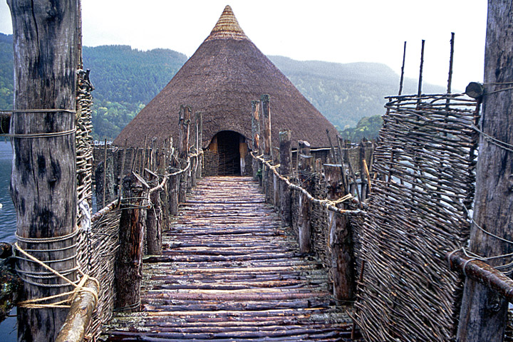 Killin (accent on the second syllable) sits at the southwestern end of fourteen-mile-long Loch Tay. This is a part of Scotland I have mostly just driven through, on my way from Edinburgh to Craigellachie or Plockton. Ron and I passed through Glen Lyon, the next glen north, in 2011. We must have passed through Killin then, although I don't remember it. I almost certainly passed through in 2001 when I visited the Scottish Crannog Centre, which at the time was on the south shore of Loch Tay, very close to the northeastern end. A crannog is a round Iron Age dwelling built on an artificial island. Construction methods varied widely across Ireland and Scotland, depending largely on what materials were at hand. The Centre had a timber-and-thatch structure built on piles, based on archeological evidence from seventeen crannogs found around the loch. Unfortunately, it burned down in 2021. Since then, the Centre has relocated to the opposite shore. They haven't built another crannog yet--there are plans for three--but there is a museum with relevant artifacts, and a replica Iron Age village, with numerous programs and activities through the season.
