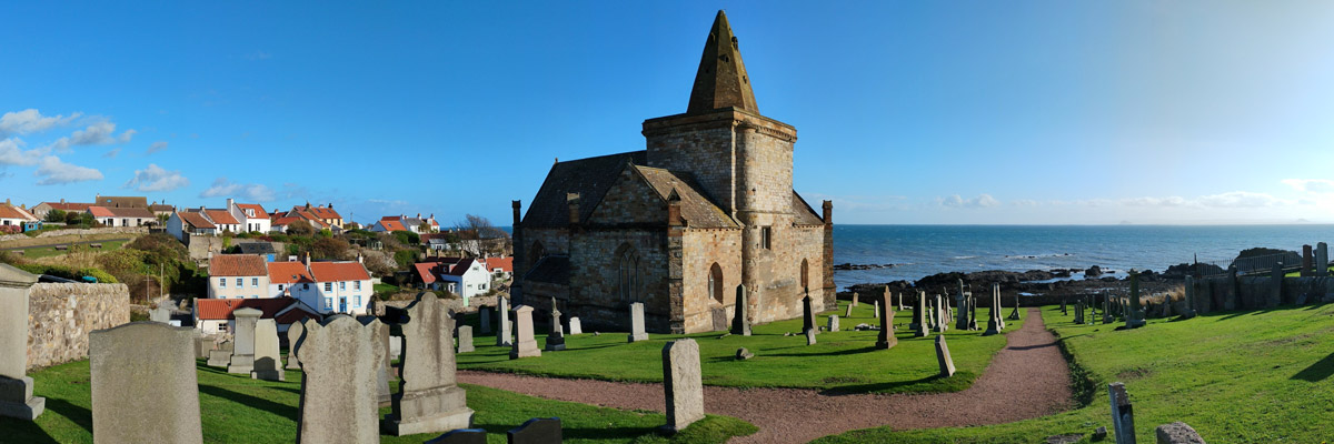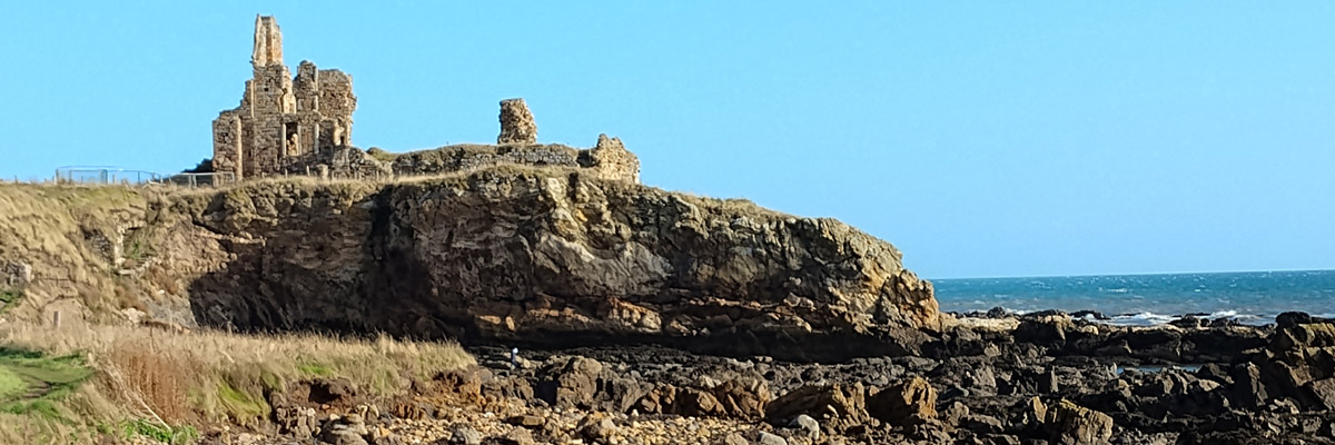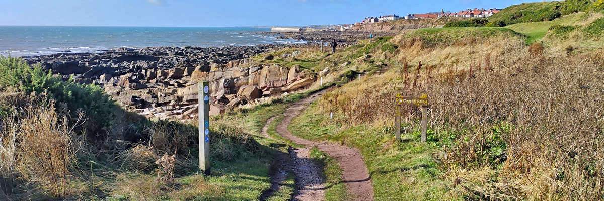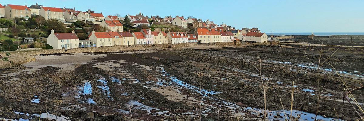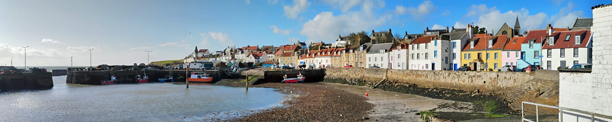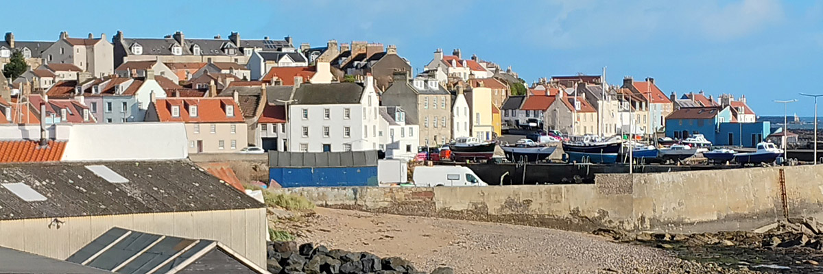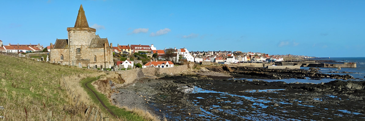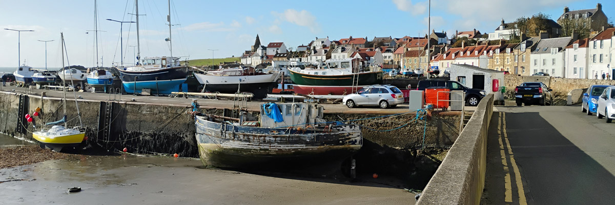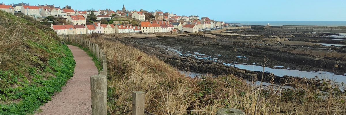 Our plans for today and tomorrow are to take walks along the Fife Coastal Path, which runs 116 miles from Kincardine, where the River Forth widens into its firth, all along the shoreline to Newburgh, where the River Tay does the same. We start out westward today, with a goal of reaching Elie and Earlsferry (two villages merged into one). It's a hike of about six and a half miles, which is a tad long for me these days, but there are opt-outs for me at the picturesque fishing ports of Pittenweem and St Monans, if my feet hurt too much. It helps that the trail is generally very flat, although there's a spot or two where erosion of the shoreline forces us into a wee bit of up-and-down. Relocation of these short stretches of trail is ongoing.