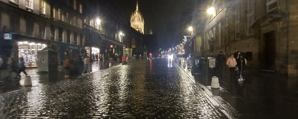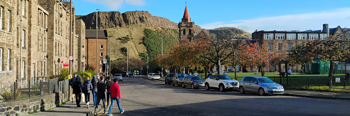 Saturday 26 October 2024--I sleep in late again, and have a Cuban sandwich at Guajira again. I like that place. I walk south along South Bridge and Nicolson Street, then cut across some side streets to the St Leonard's neighborhood, in the shadow of the Salisbury Crags in Holyrood Park. I chance upon the Holyrood Distillery, which opened in 2019, and pop in to browse their shop. I guess I don't need another Glencairn glass. The distillery isn't the reason I've come down this way, but stumbling into it is appropriate enough, as the building was once the goods shop for the Edinburgh and Dalkeith Railway, the first line built into Edinburgh, in 1831. Its purpose was to bring coal into the city from the pits in Dalkeith, six miles or so southeast. The line came to be known as the Innocent Railway, thought by many to be because the horse-drawn wagons were safer than the steam-engine technology then in its infancy. That doesn't ring true...perhaps the wag who so dubbed it had the converse of Blake's dark satanic mills in mind.