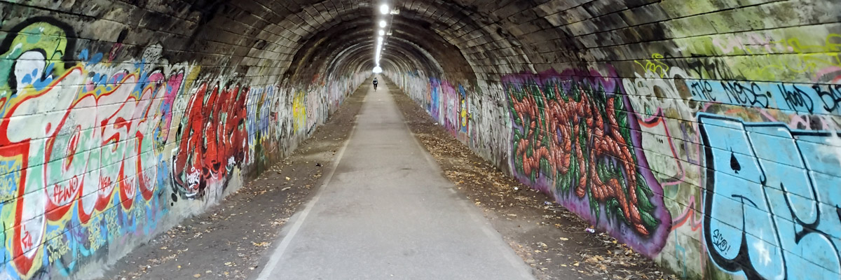 The rails are long gone, but the obscured path of the railway can be followed east a few hundred yards to the Innocent Railway Tunnel, my real destination. It's said to be the first railway tunnel in Scotland--there's one in Dundee that was completed a few weeks earlier, but this was the first to be used. (I see it called the first in the UK in one source, but that is almost certainly incorrect.) The tunnel, 518 meters long, was closed up when the railway ceased operations in 1968, but it was reopened as part of a walking and cycling trail in the 1980s. There's a grade of about 3% leading up toward St Leonard's, which was too much for the horses. The cars were drawn up on a rope by a steam engine at the terminus. I peer down into the tunnel, and leave it at that. If I ever walk to the Sheep Heid in Duddingston again, I'll take this route.
